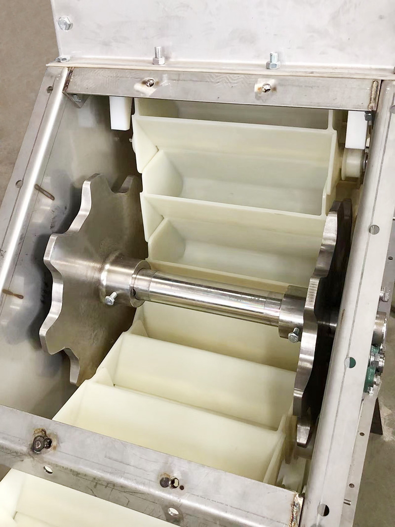 (1)驱动功率小,采用流入式喂料、诱导式卸料、大容量的料斗密集型布置,在物料提升时几乎无回料和挖料现象,因此无效功率少。